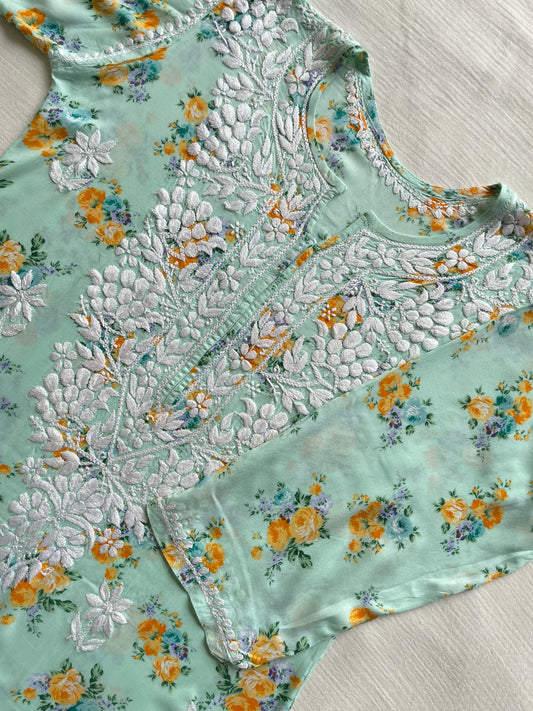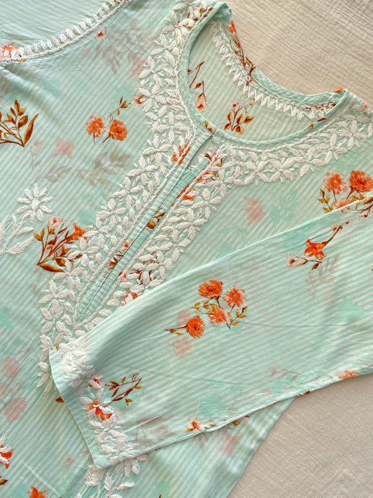 Sara Mul Mul Long Chikankari Kurti (Sea Green)