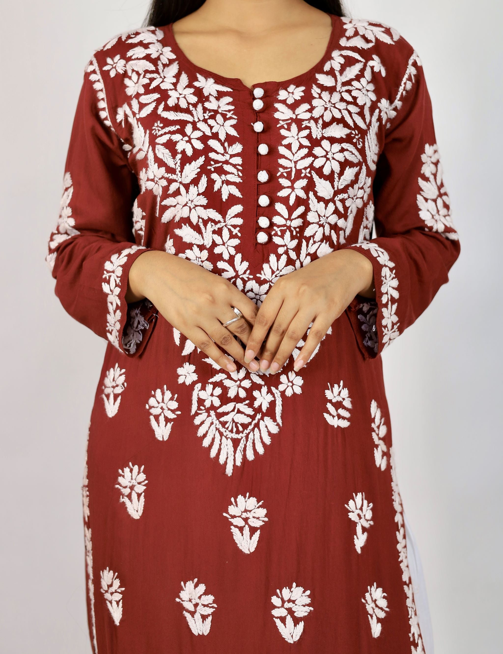 Mahira Modal Long Chikankari Kurti ( Maroon)
