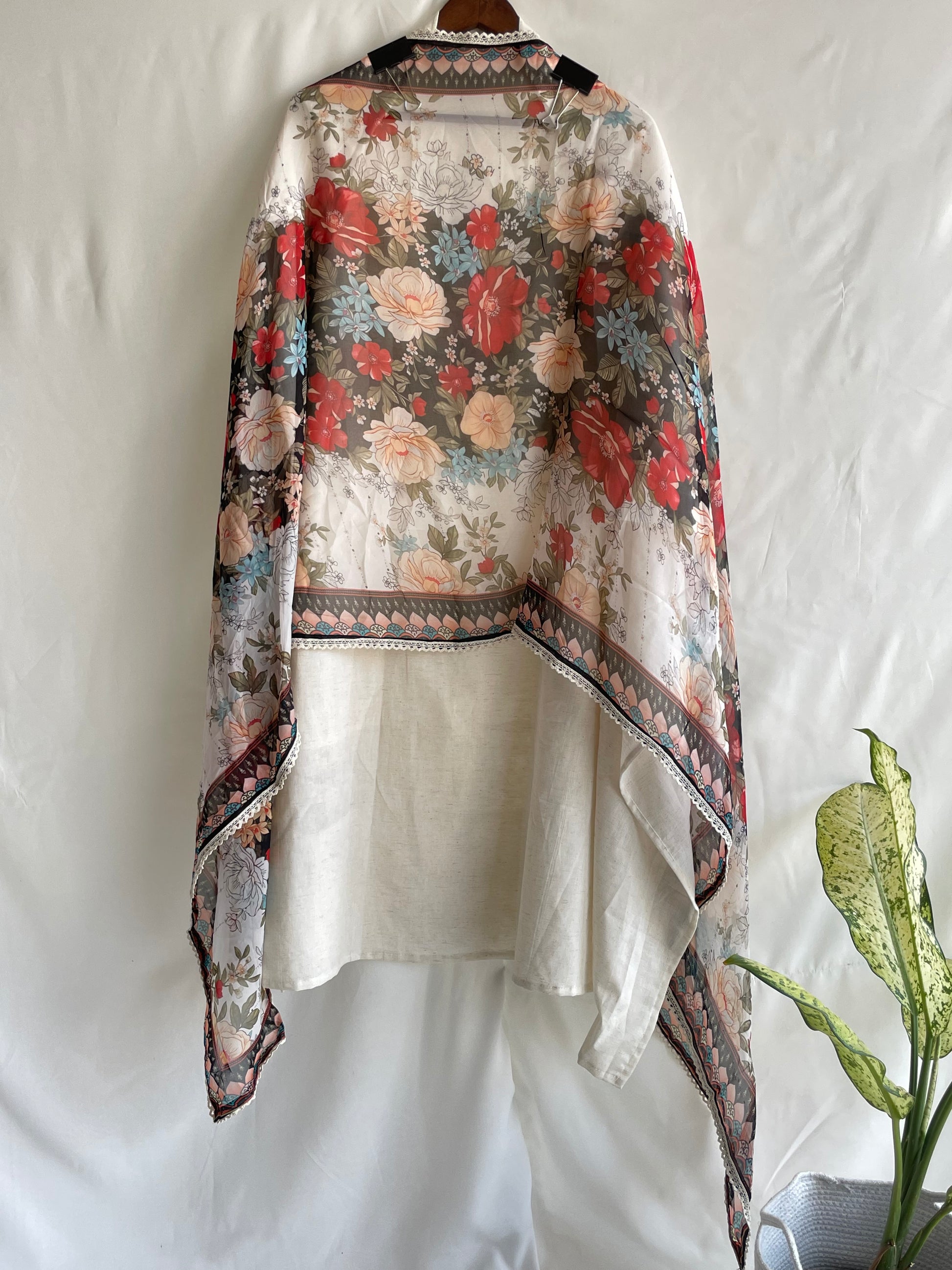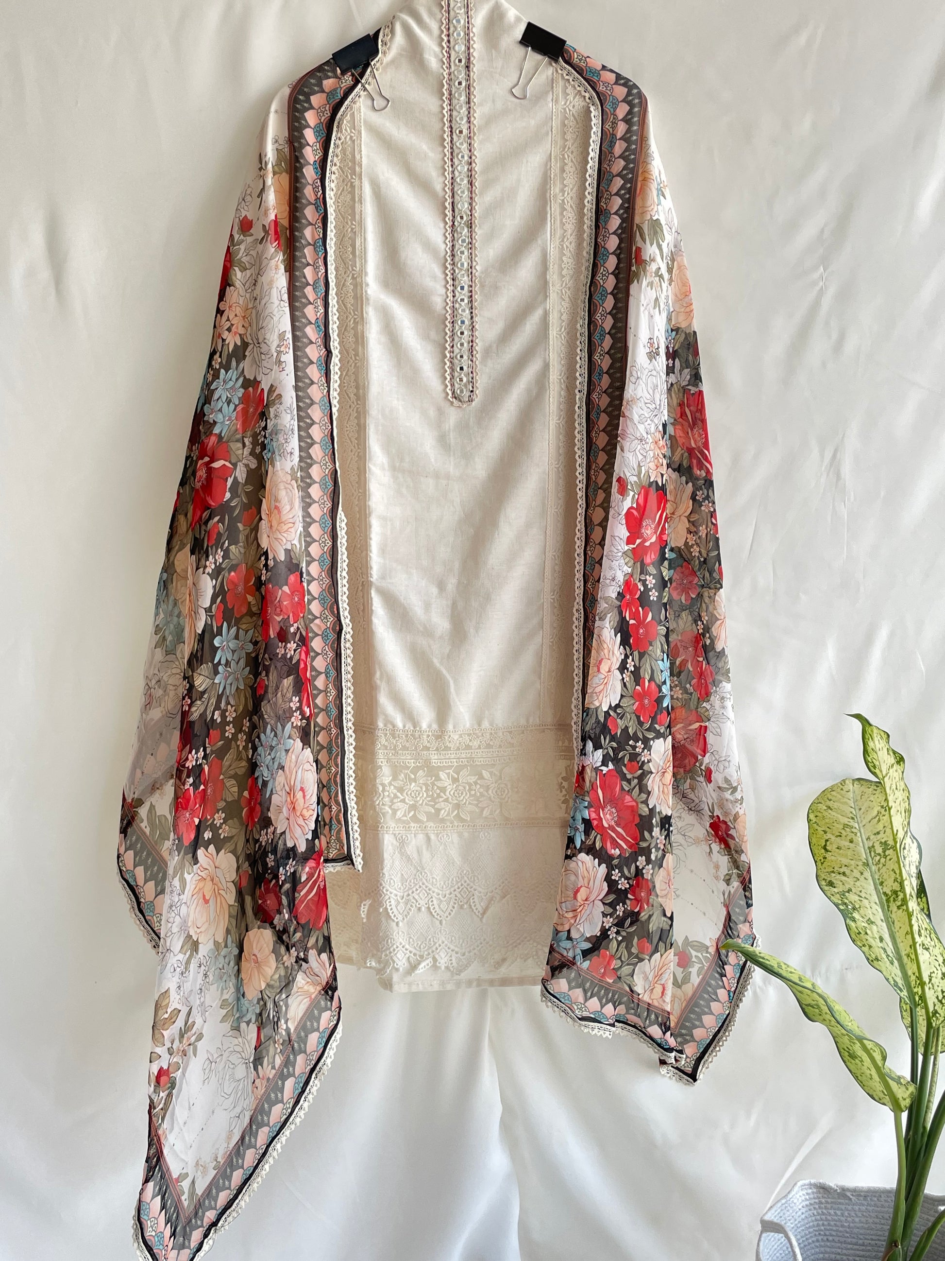 Pure cotton Unstitched suit set with Beautiful Black Floral Dupatta